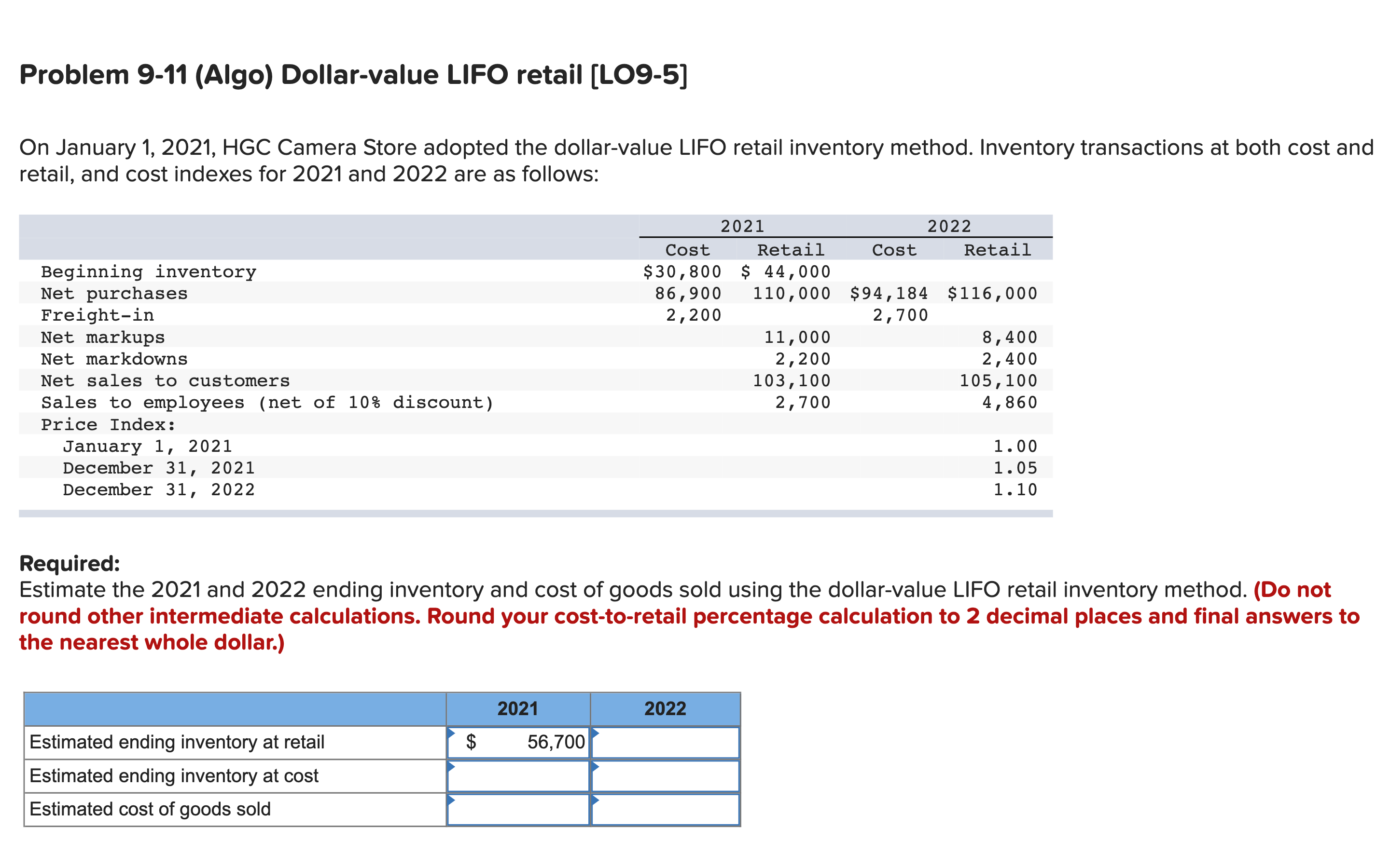 Solved Problem 9 11 Algo Dollar Value Lifo Retail Lo9 5 Chegg Com