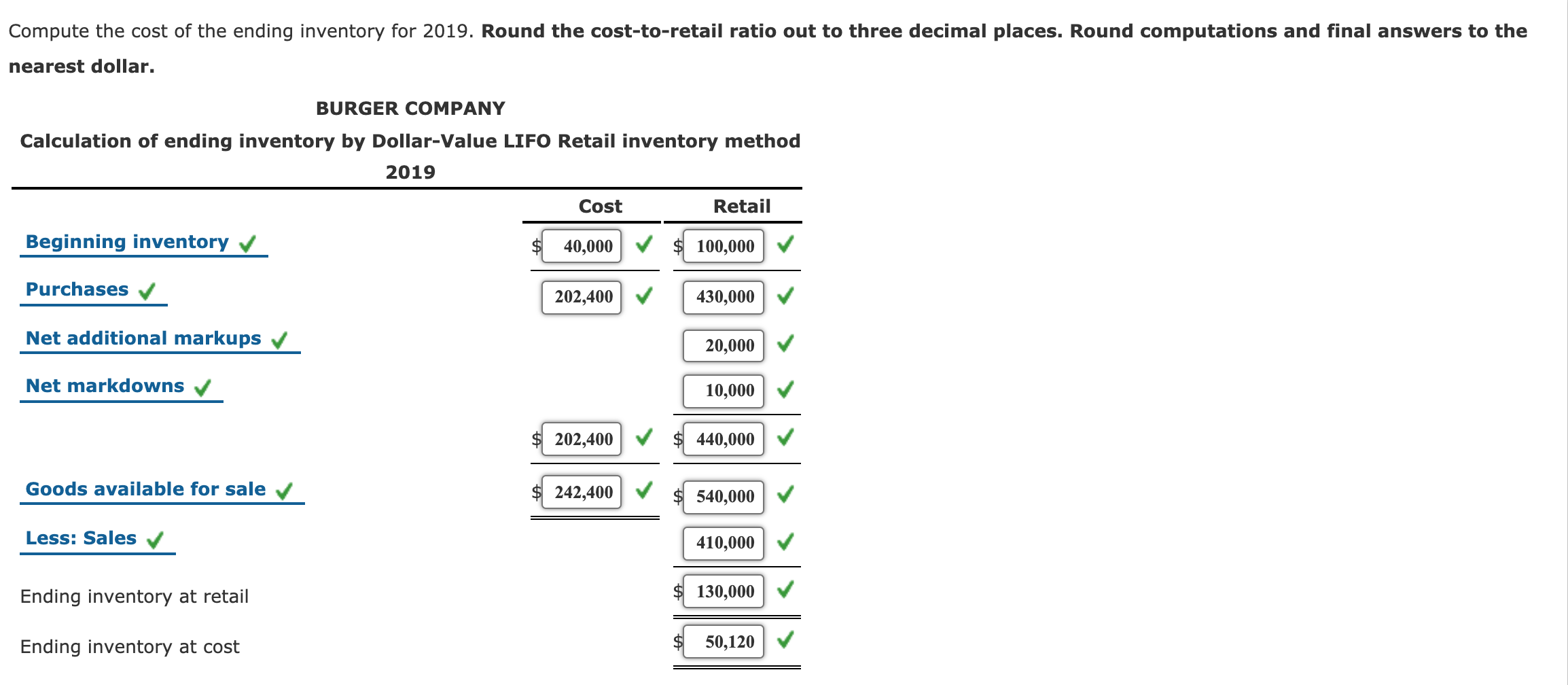 2018 2019 Cost Retail 39200 56000 Cost Retail Beginning inventory Net purchases Freight-in Net markups Net markdowns Net sales to. LIFO uses the same units purchased and units sold data presented above and you use the chart to compute cost of goods sold and ending inventory. In essence the method aggregates cost information for large amounts of inventory so that individual cost layers do not need to be compiled for each item of inventory.